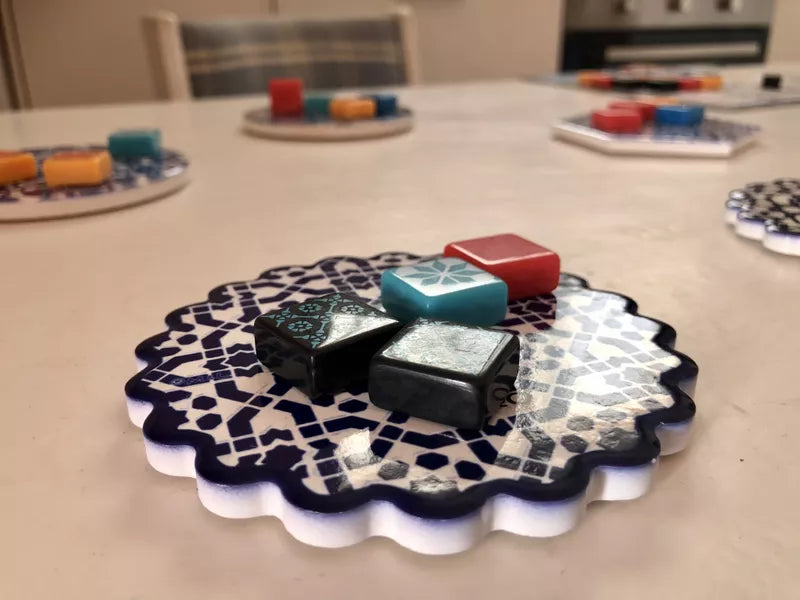 In the game Azul, players take turns drafting colored tiles from suppliers to their player board. Later in the round, players score points based on how they've placed their tiles to decorate the palace. Extra points are scored for specific patterns and completing sets; wasted supplies harm the player's score. The player with the most points at the end of the game wins.