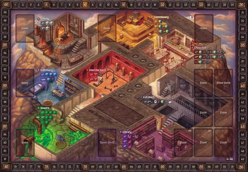 - Patrol Phase - New resources are placed on the gameboard, and the guards patrol the dungeon. Players with high suspicion are raided, and their chambers are searched.