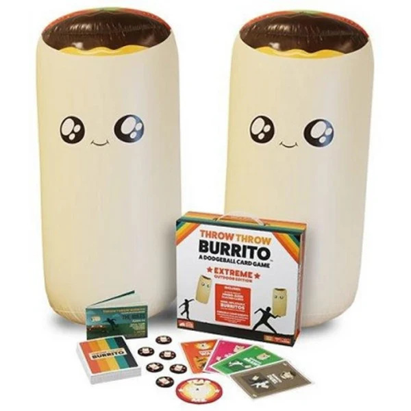 This is the ~extreme~ version of the hit dodgeball card game Throw Throw Burrito. Inflate the pair of huge, inflatable Burritos, place them near a table and deal out the cards. Earn points by collecting three of a kind. Play Burrito Cards and force your friends to battle. Duel to determine the winner. Duck, dodge and dive incredibly large, airborne burritos or get hit and receive a Burrito Bruise!